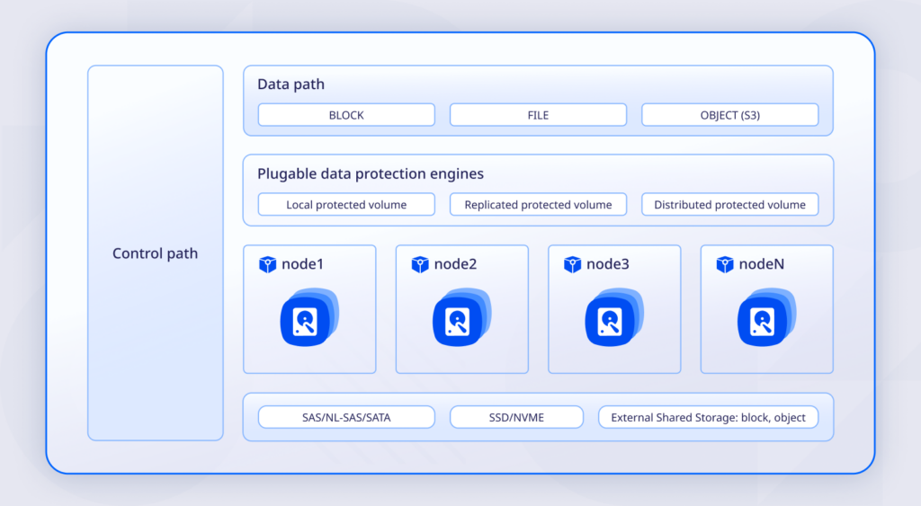 Поверх этих компонентов формируется мета-слой. Он позволяет создавать сервисы хранения декларативно — вы описываете нужные параметры, а система автоматически подбирает подходящую конфигурацию на доступных ресурсах.