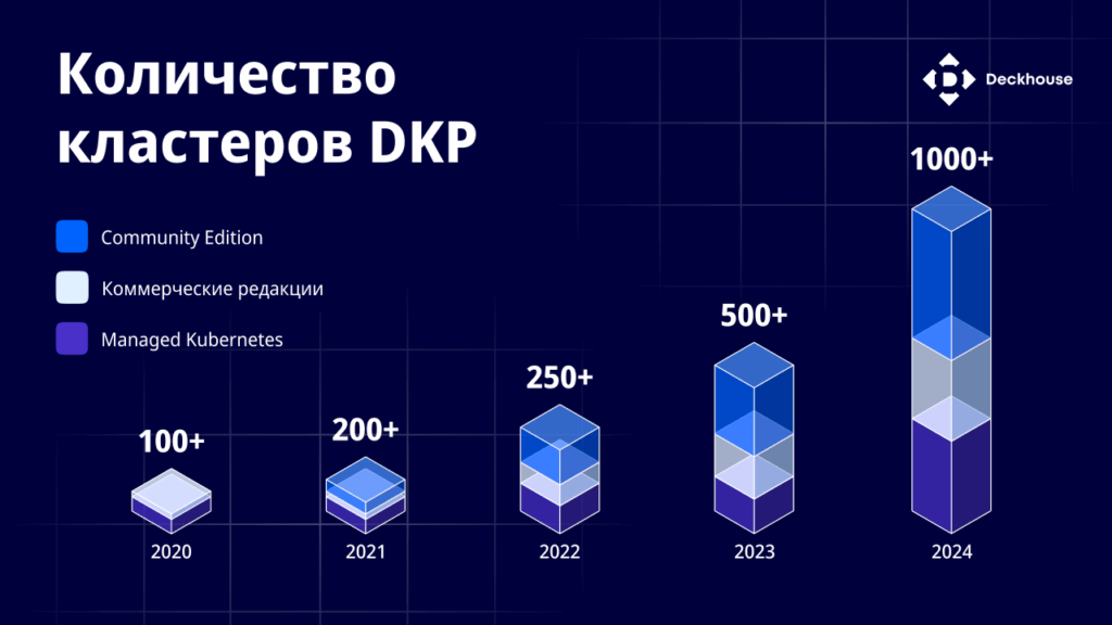 В начале 2025 года платформа контейнеризации Deckhouse Kubernetes Platform (DKP) достигла значительного этапа в своём развитии — количество кластеров под её управлением превысило тысячу. Этот впечатляющий результат охватывает компании из множества отраслей: ретейл, промышленность, банкинг, финтех, нефтегаз, государственные структуры, ИТ, медицина, образование, логистика и СМИ.