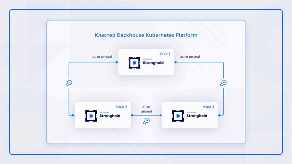 Чтобы решить эти проблемы, в Deckhouse Stronghold мы реализовали свой собственный способ распечатывания хранилища. Его принцип действия заключается в том, что любой активный узел в кластере обнаруживает и автоматически распечатывает остальные узлы при условии, что у них валидный сертификат.