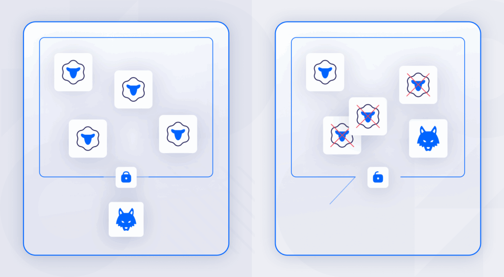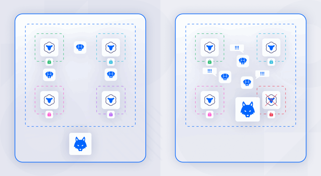 Таким образом, кластер Kubernetes — это совокупность тесно взаимосвязанных компонентов, которые могут передавать друг другу секретную информацию и к которым можно получить доступ снаружи. Кроме того, это очень подвижная система: постоянно создаются и удаляются поды, движется трафик, меняются права доступа. Поэтому периметр в кластере существует лишь условно, а всё взаимодействие компонентов внутри кластера находится в «слепой зоне» периметра. Это значит, что кластер не будет качественно защищён, если организовать защиту по модели Perimeter-based.