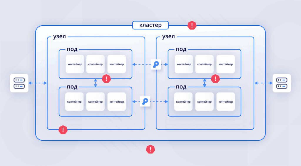 В Kubernetes контейнеры организуются в группы (поды) и размещаются на узлах кластера. Узлы могут коммуницировать друг с другом и с другими компонентами внутри и извне кластера. Также в кластере может передаваться и храниться конфиденциальная информация (ключи, пароли). Подробнее о том, что такое Kubernetes и микросервисы, мы рассказывали в отдельной статье.