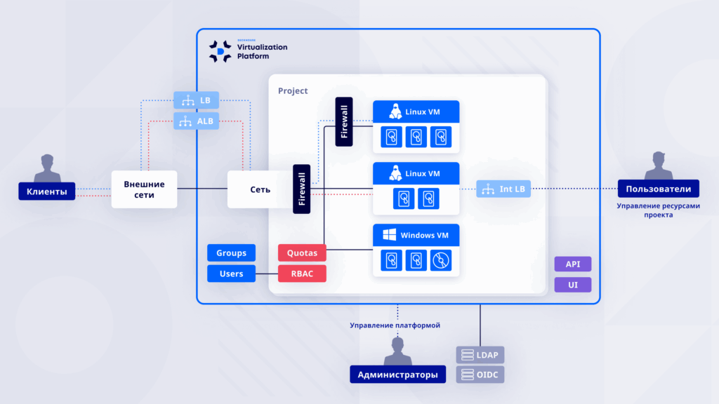 Для обеспечения безопасности и разделения доступов в мультитенантной среде доступны деление на проекты, группы, роли в системе и установление квот.