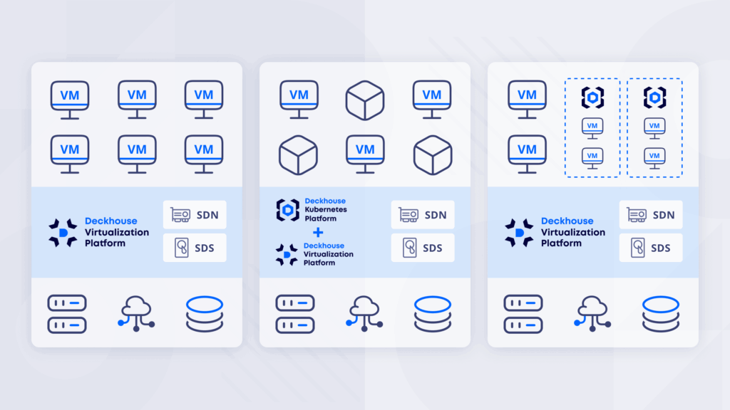 Модуль полностью интегрирован с другими продуктами экосистемы Deckhouse, что позволяет использовать все её возможности для работы и с виртуальными машинами. Использование виртуализации Deckhouse как инфраструктурного слоя для развёртывания парка кластеров DKP позволяет существенно экономить на покупке отдельного слоя виртуализации для своих гипервизоров.