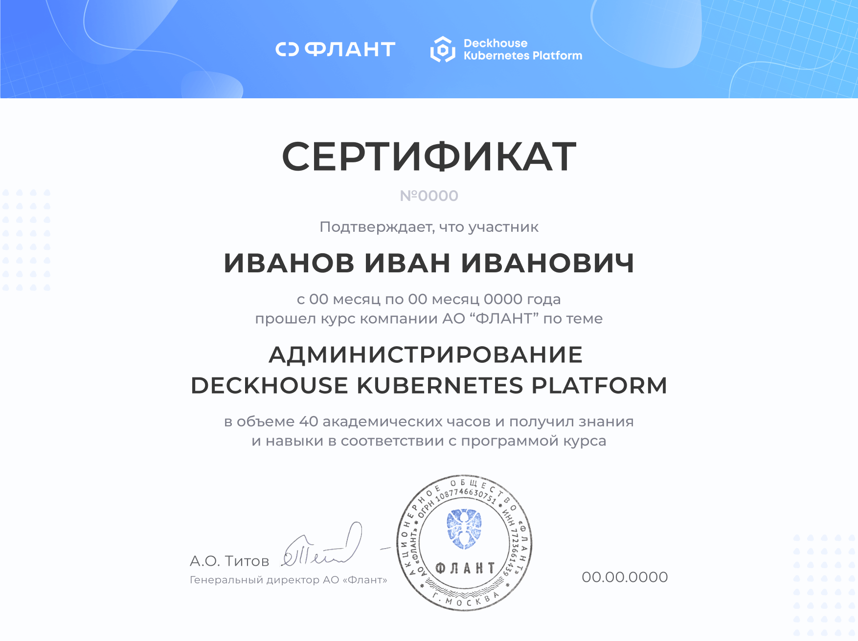 На курсе вы освоите процесс установки и обновления Deckhouse Kubernetes Platform, изучите встроенные модули и сможете их настраивать, а также научитесь управлять узлами, пользователями и доступами. На период обучения для выполнения практических заданий и отработки навыков предоставляется учебный стенд.