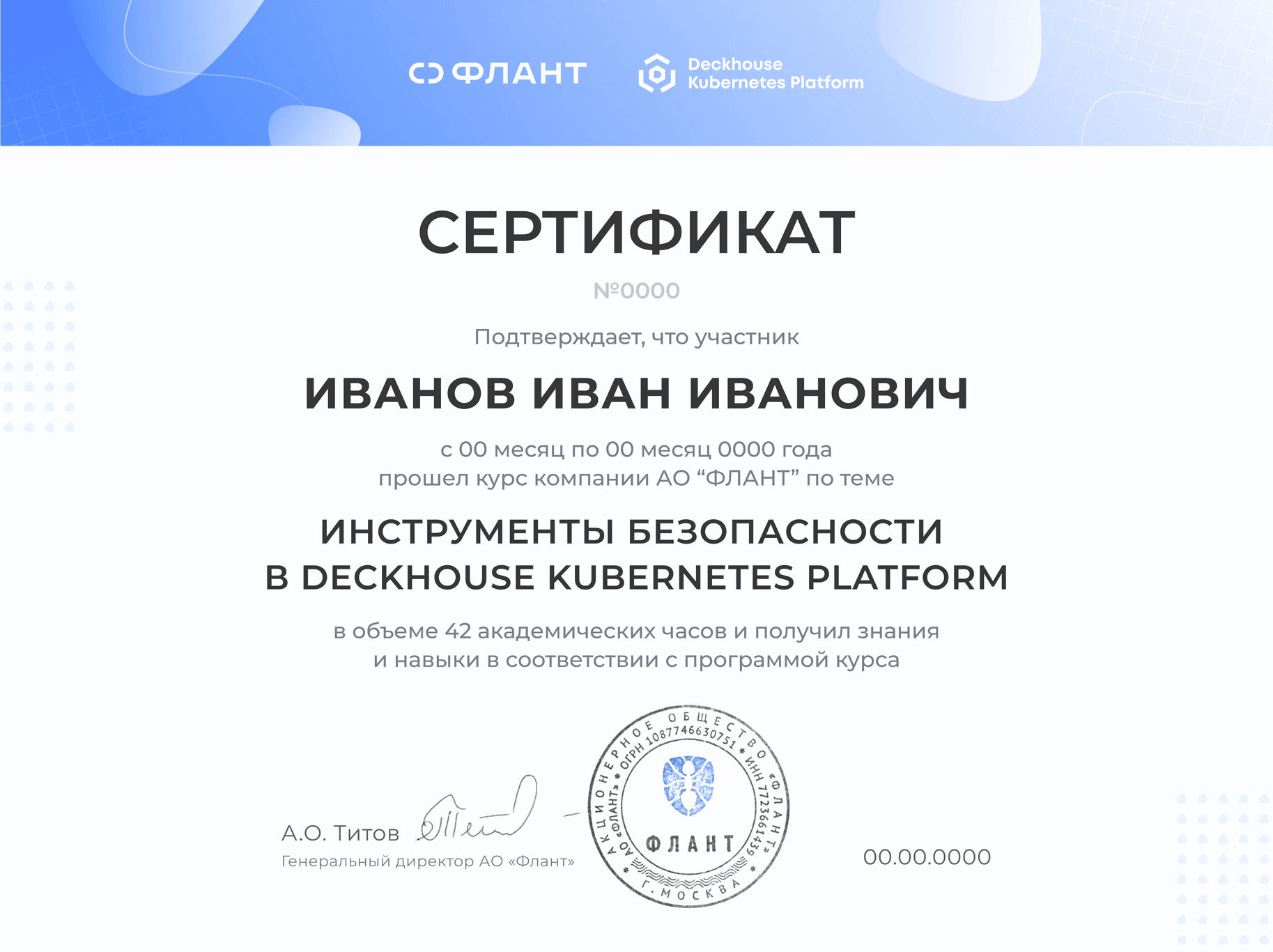 На курсе вы изучите основные возможности инструментов безопасности в Deckhouse Kubernetes Platform, научитесь минимизировать угрозы информационной безопасности, создавать и применять политики безопасности и проводить аудит кластера, познакомитесь с механизмами распределения прав и управления секретами. На период обучения предоставляется учебный стенд для выполнения практических заданий.