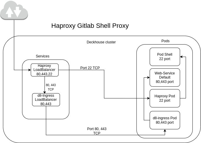 Для проксирования внешнего TCP-трафика через порт 22 (Git SSH) предусмотрена специальная опция в конфигурации модуля. При её использовании разворачивается Haproxy с сервисом типа LoadBalancer. Haproxy перенаправляет трафик с порта 22 на соответствующий Git SSH Pod. Порты 80 и 443 продолжают обрабатываться d8-ingress-nginx, где происходит терминация TLS-трафика.