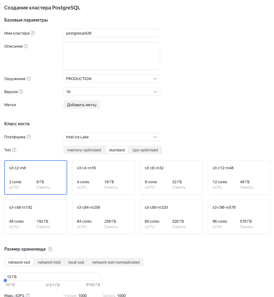 - Выберите класс хостов — он определяет технические характеристики виртуальных машин, на которых будут развернуты хосты БД. Все доступные варианты перечислены в разделе Классы хостов. При изменении класса хостов для кластера меняются характеристики всех уже созданных хостов.