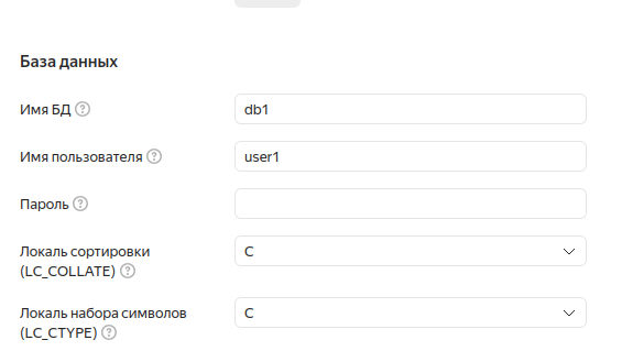 зарезервированы для собственных нужд Managed Service for PostgreSQL. Создавать базы с этими именами нельзя. - Имя пользователя — владельца БД и пароль. По умолчанию новому пользователю выделяется 50 подключений к каждому хосту кластера.