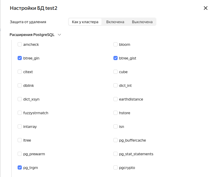 - Выберите кластер из списка и перейдите на вкладку Базы данных. Выберите базу данных и включите следующие расширения: