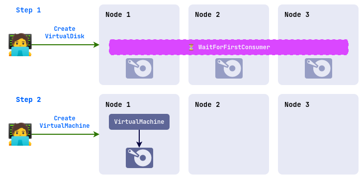 Помните, если Ваш StorageClass имеет настройку WaitForFirstConsumer, диск будет ожидать создания ВМ с этим диском. Статус диска в этом случае