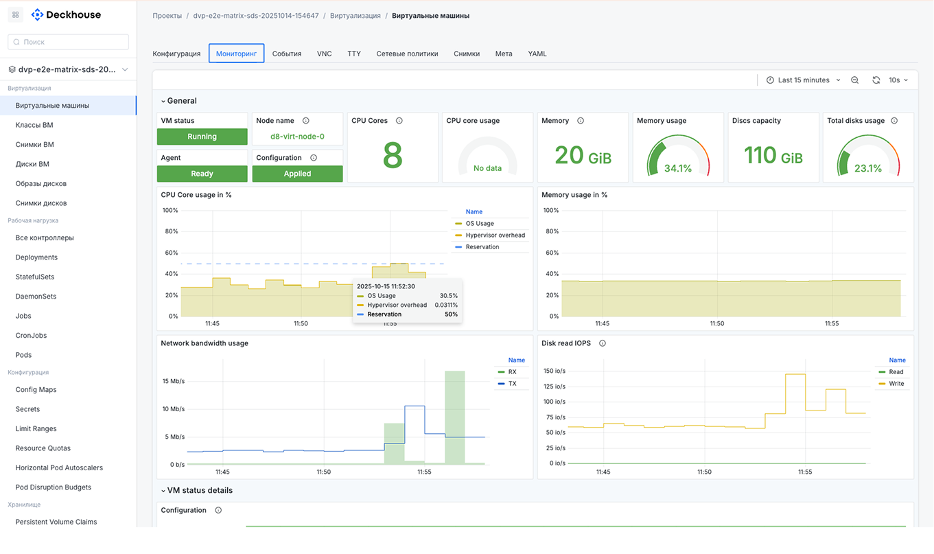 Виртуализация интегрирована в DKP на всех уровнях: к ВМ применяются политики Cilium, используется стандартная балансировка через Kubernetes Service, а все операции отражаются в общей системе мониторинга