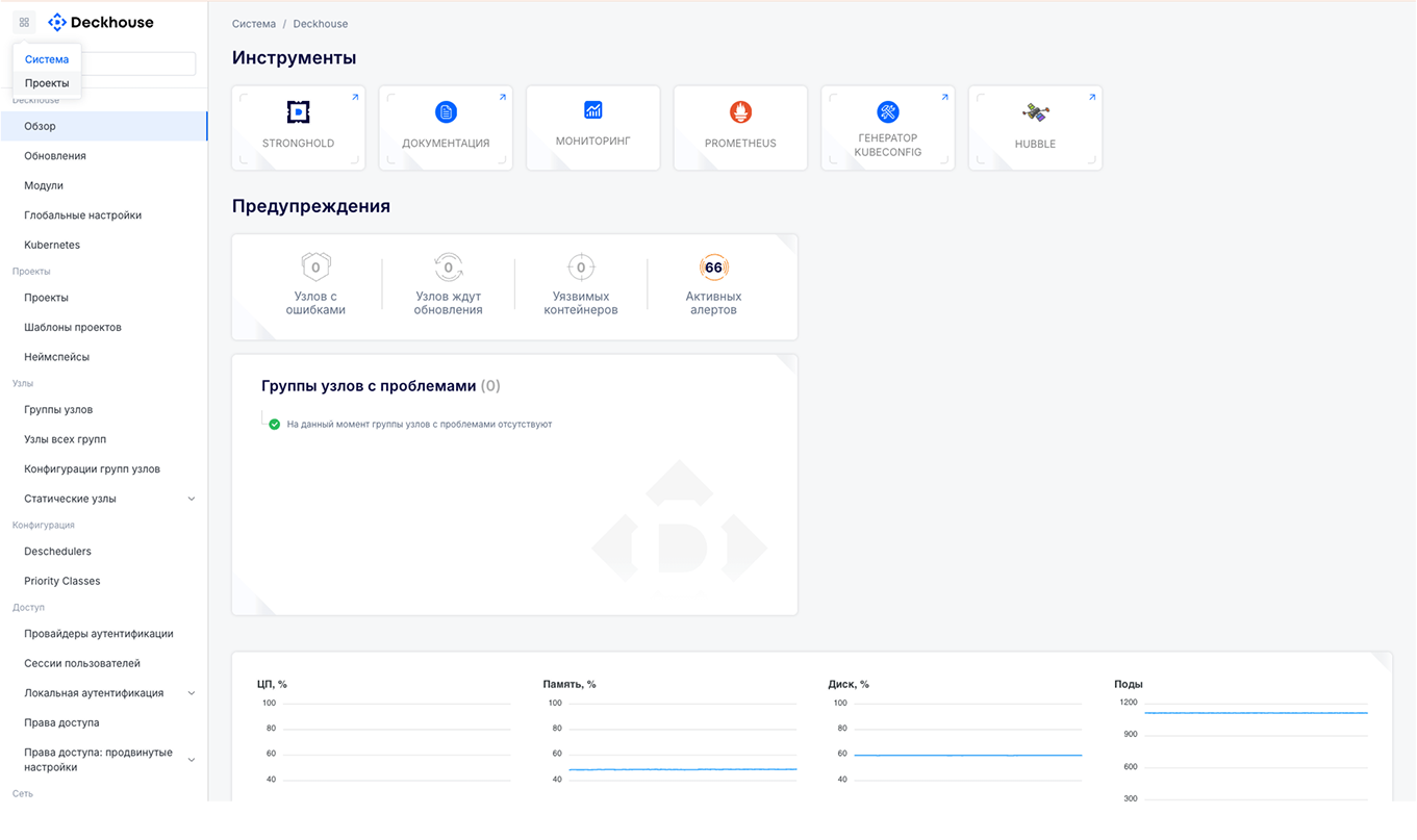 Веб-интерфейс DKP позволяет отслеживать состояние виртуальных машин, управлять ресурсами и рапределять их, а также диагностировать сбои кластера