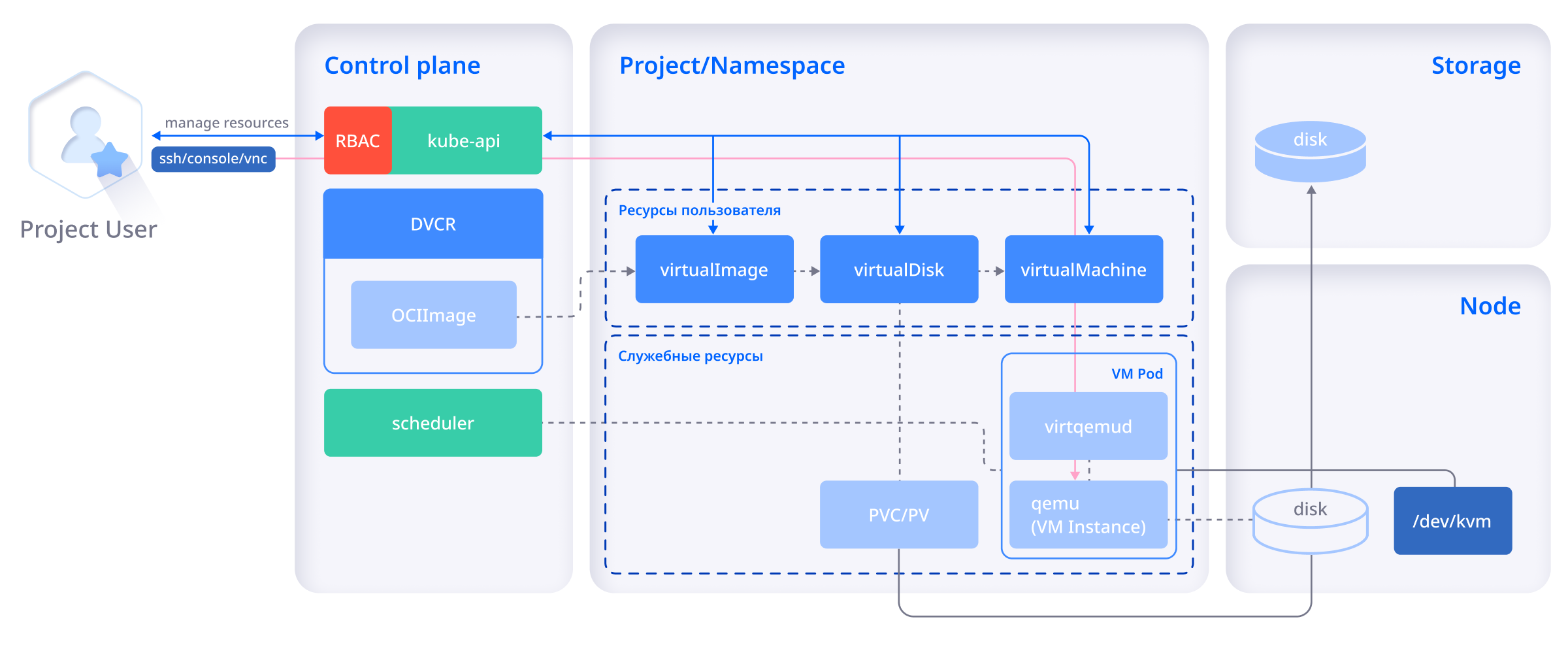- Virtualization API — контроллер для управления виртуальными машинами как стандартными объектами Kubernetes