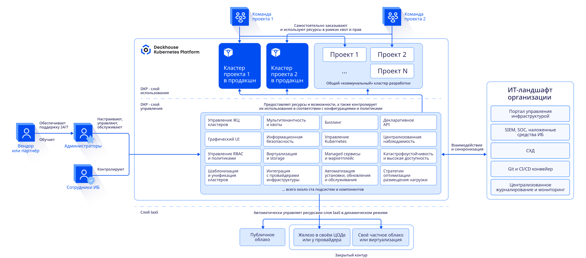 Deckhouse Kubernetes Platform (DKP) — полностью готовая к работе платформа, которая стандартизирует работу с Kubernetes для организаций любого масштаба и профиля
