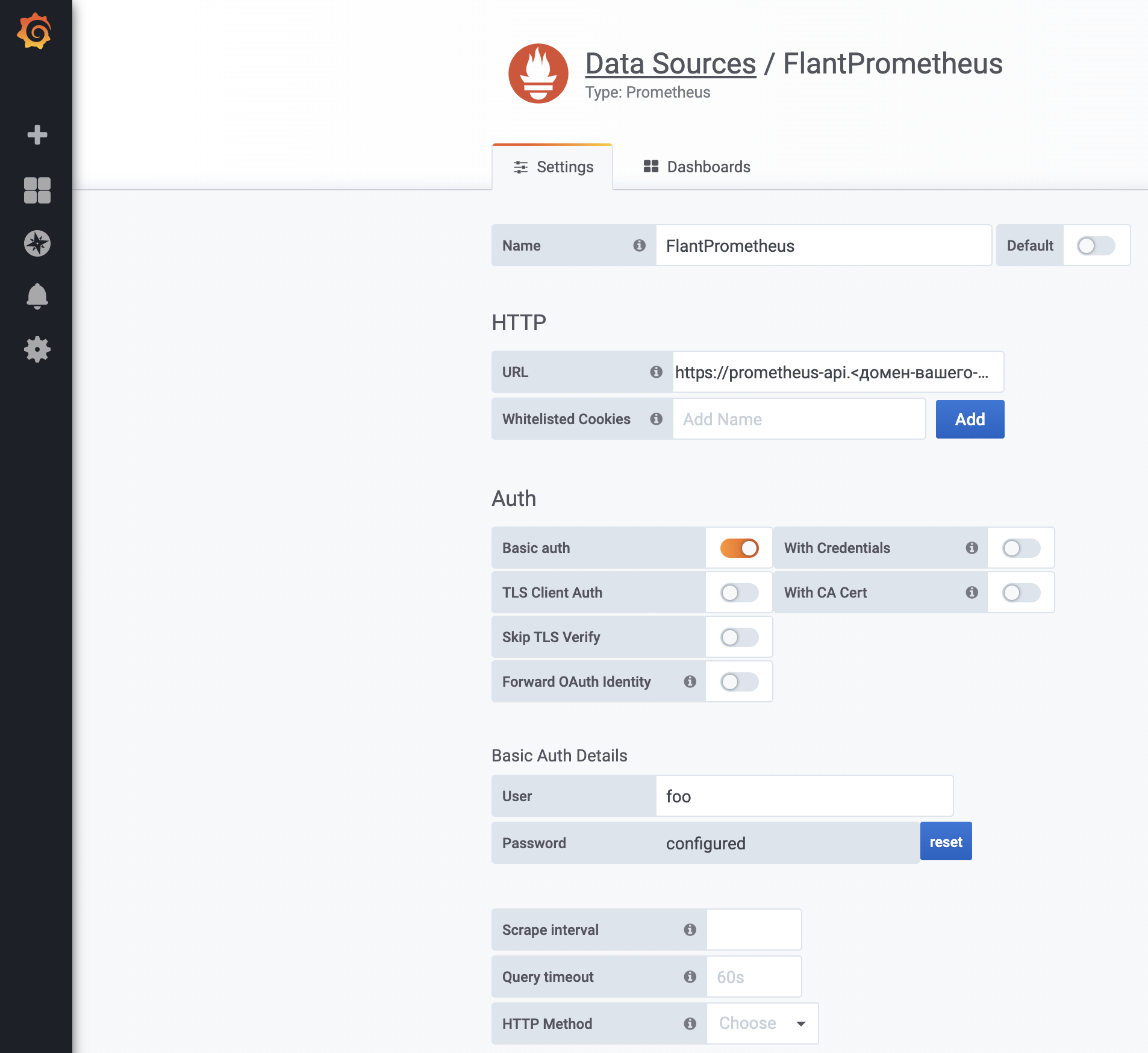 В качестве URL необходимо указать https://prometheus-api.<домен-вашего-кластера>**